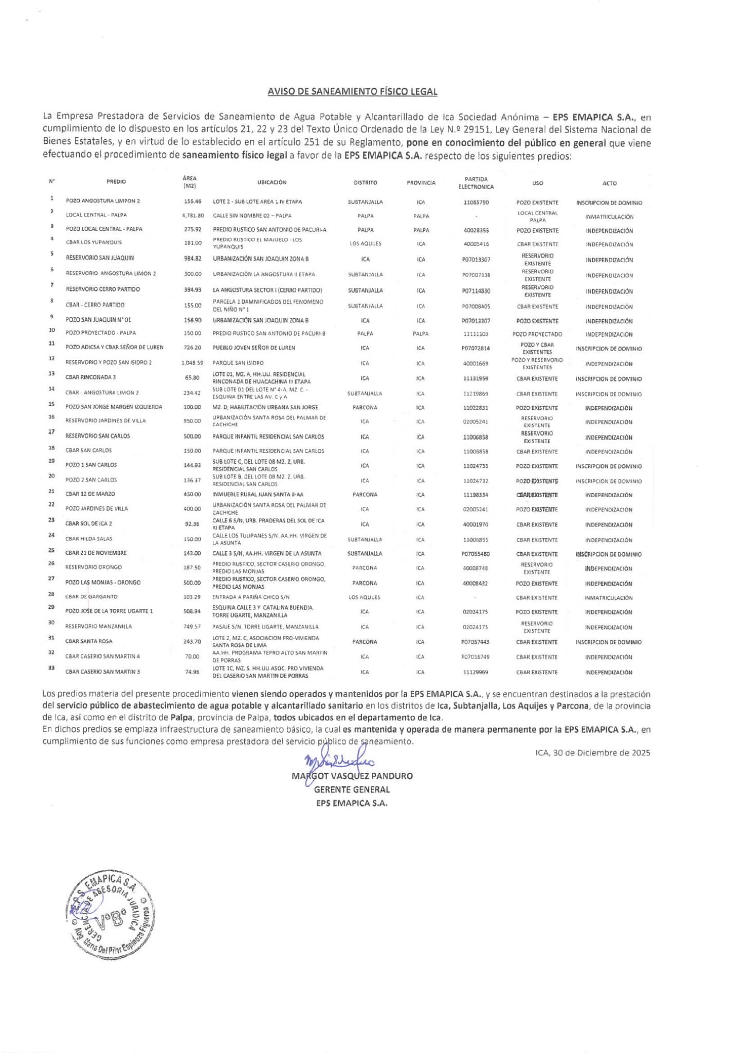 La EPS EMAPICA, en cumplimiento de lo dispuesto en los artículos 21, 22 y 23 del Texto Único Ordenado de la Ley N.º 29151, Ley General del Sistema Nacional de Bienes Estatales, y en virtud de lo establecido en el artículo 251 de su Reglamento, pone en conocimiento del público en general que viene efectuando el procedimiento de saneamiento físico legal a favor de la EPS EMAPICA S.A., respecto de los siguientes predios