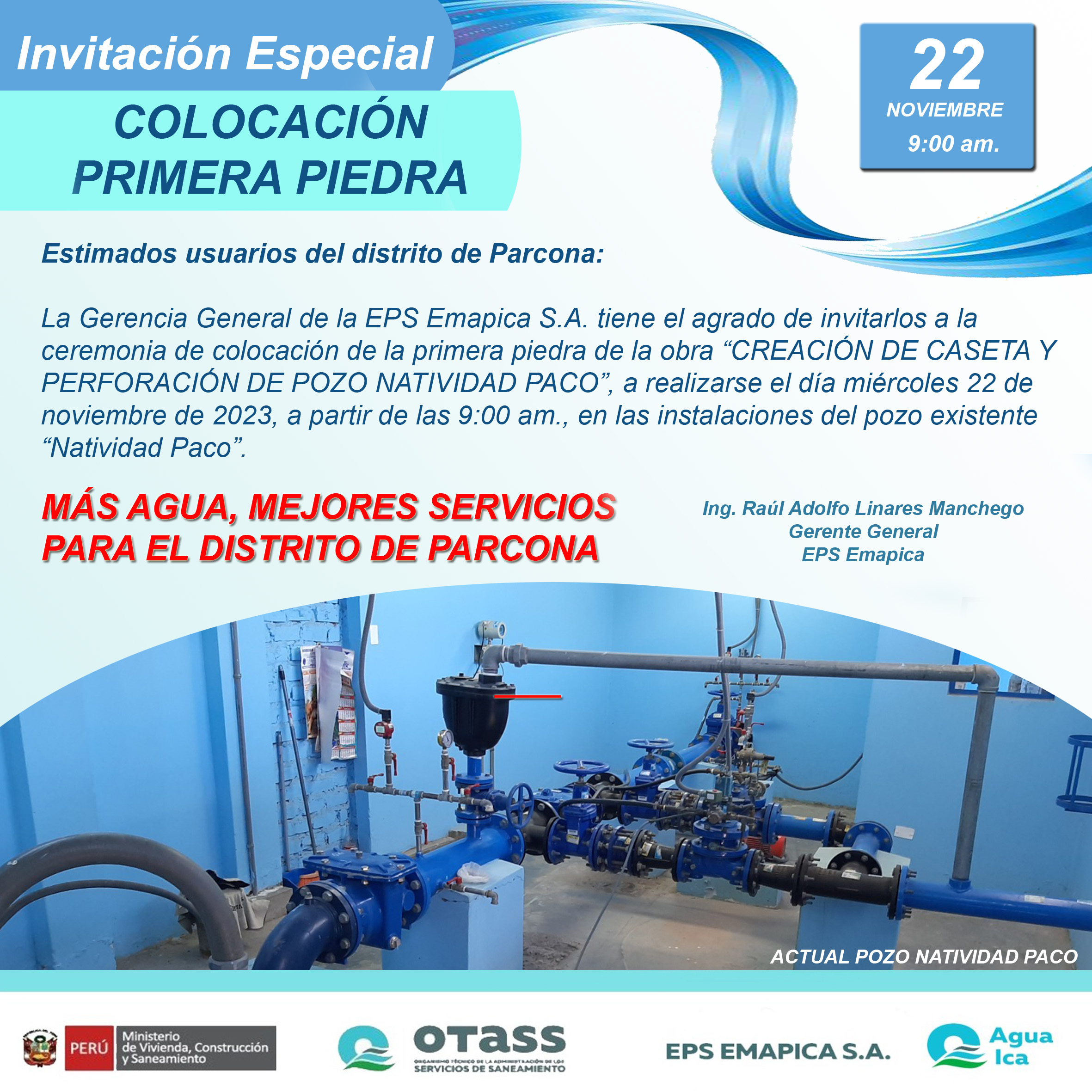 Emapica realizará la colocación de primera piedra de la obra “ð‚ð‘ð„ð€ð‚ðˆÃ“ð ðƒð„ ð‚ð€ð’ð„ð“ð€ ð˜ ðð„ð‘ð…ðŽð‘ð€ð‚ðˆÃ“ð ðƒð„ ððŽð™ðŽ ðð€ð“ðˆð•ðˆðƒð€ðƒ ðð€ð‚ðŽâ€, en el distrito de Parcona, evento se llevará a cabo el miércoles 22 de noviembre, a horas 9:00 a.m. en la Calle Natividad Paco. Esta importante obra permitirá ampliar la cobertura del servicio de agua potable en beneficio de más de 9 mil familias del distrito de Parcona. El proyecto consiste en la perforación del pozo tubular de 145 m. de profundidad con Ø 21â€, la construcción de caseta de bombeo 84.18 m2 con lÃnea de media tensión equipada con sistema de telemetrÃa. Además de la instalación de 1024.63 metros lineales de tuberÃa de agua potable de PVC. Cabe precisar que, esta obra se ejecuta con recursos directamente recaudados por Emapica y da inicio al cumplimiento de las metas de gestión del quinquenio regulatorio 2023-2028. ¡ð™ˆÃ¡ð™¨ ð™–ð™œð™ªð™–, ð™¢ð™šð™Ÿð™¤ð™§ð™šð™¨ ð™¨ð™šð™§ð™«ð™žð™˜ð™žð™¤ð™¨ ð™¥ð™–ð™§ð™– ð™šð™¡ ð™™ð™žð™¨ð™©ð™§ð™žð™©ð™¤ ð™™ð™š ð™‹ð™–ð™§ð™˜ð™¤ð™£ð™–! #AguaIca 💧