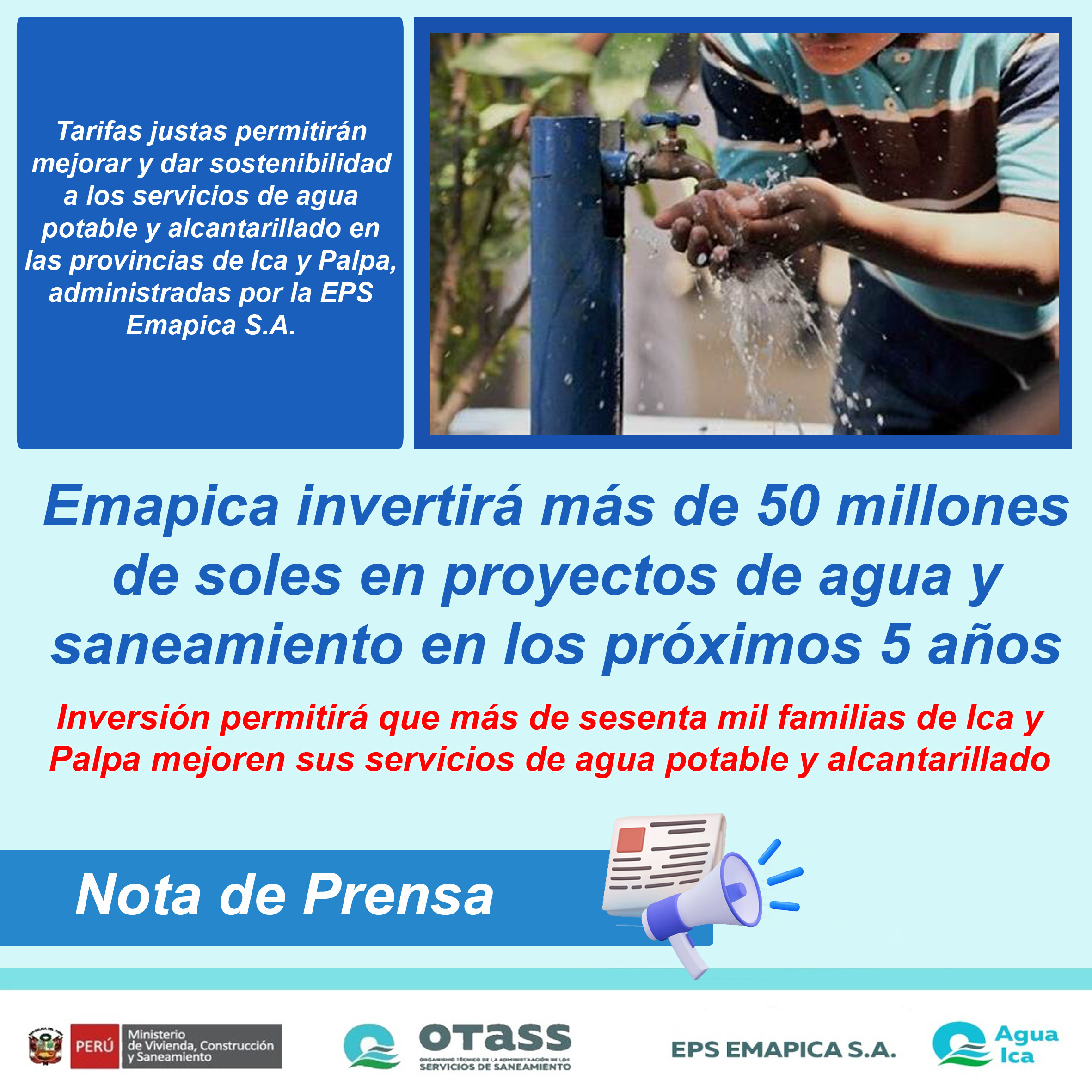 Inversión permitirá que más de sesenta mil familias de Ica y Palpa mejoren su servicio de agua potable y alcantarillado (Ica, 5 de diciembre de 2023) Mediante la Resolución de Consejo Directivo N.° 036-2023-SUNASS-CD, la Superintendencia Nacional de Servicios de Saneamiento – Sunass aprobó, en el mes de setiembre, la estructura tarifaria y metas de gestión que la EPS EMAPICA S.A. deberá implementar en el periodo regulatorio 2023-2028. Con la tarifa recaudada, la EPS Emapica S.A. priorizará inversiones por S/ 50´050,231.00 soles que se ejecutarán en los próximos cinco años, con la finalidad de optimizar la continuidad y presión del servicio, para que la población tenga más horas de agua y mejores redes de alcantarillado para evitar colapsos y el desborde de los desagües en zonas vulnerables. Asimismo, se destinarán S/ 1´673,502.00 soles para el cuidado y conservación de las fuentes de agua a través de los Mecanismos de Retribución por Servicios Ecosistémicos (Merese) y S/ 740,473.00 soles corresponden a inversiones en gestión de riesgos de desastres y adaptación al cambio climático. Asimismo, la tarifa aprobada incorpora la implementación del sistema de subsidio cruzado focalizado, el cual se aplica en la facturación del mes de noviembre del presente año. Con esta medida, 6123 familias en condición de pobreza o pobreza extrema accederán al servicio pagando una tarifa menor a la del costo real del servicio gracias al subsidio cruzado focalizado. Para determinar a los usuarios en situación de pobreza se utilizarán como herramientas los planos estratificados del INEI y el Sistema de Focalización de Hogares (SISFOH) del Ministerio de Inclusión Social (Midis). Además, se ha realizado la nivelación de las tarifas de los usuarios de Ica, teniendo como base la tarifa vigente de la provincia de Palpa. Estas acciones buscan mantener tarifas justas que permitan mejorar y dar sostenibilidad a los servicios de agua potable y alcantarillado en las provincias de Ica y Palpa, administradas por la EPS Emapica S.A.